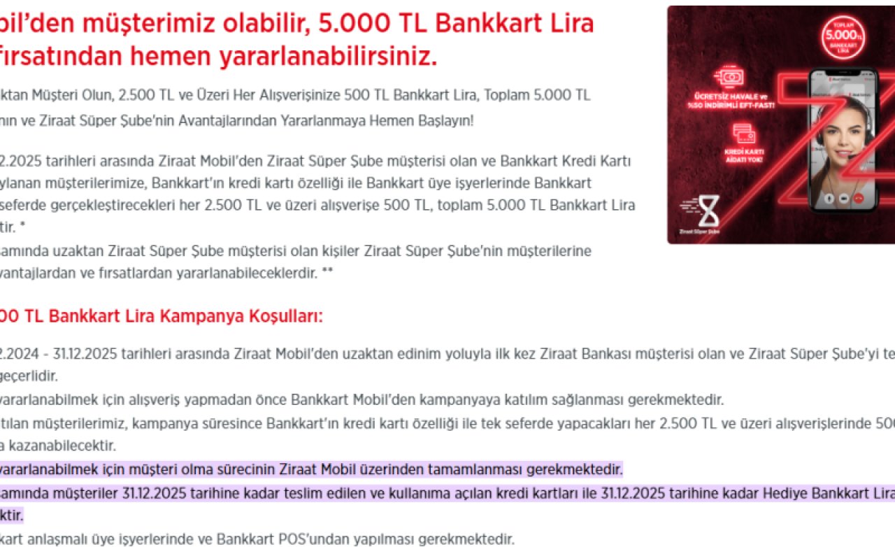 Ziraat Bankası’nın duyurduğu bu kampanya, yalnızca Ziraat Mobil üzerinden uzaktan müşteri olan yeni kullanıcıları kapsıyor. Kampanyadan yararlanmak isteyenlerin, müşteri olma sürecini dijital kanallar üzerinden tamamlaması ve Ziraat Süper Şube müşterisi olması gerekiyor. Bankkart kredi kartı başvurusu onaylanan kullanıcılar kampanya kapsamına dahil ediliyor.